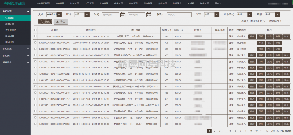 供燈數據后臺,善款清晰明了,供燈狀態一目了然,善款一鍵導出方便統計